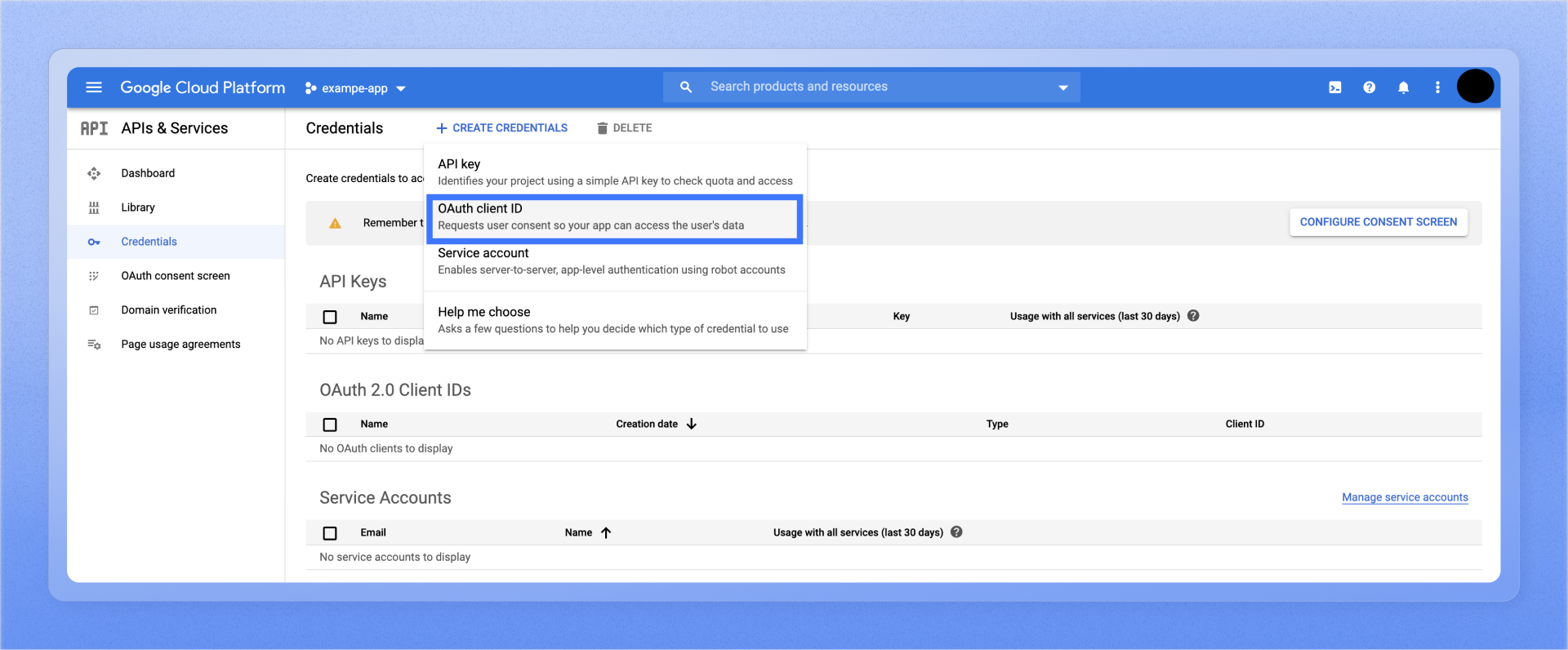 - Navigate to the Credentials screen, click Create Credentials, and select OAuth client ID from the options given.